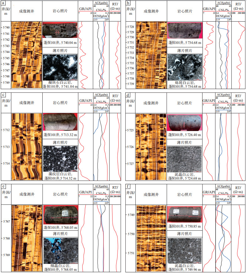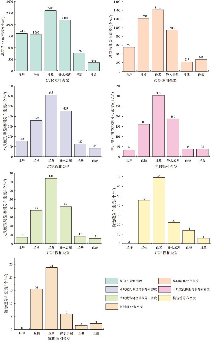 摘要: 针对四川盆地蓬莱气区震旦系灯影组白云岩储层沉积微相类型与物性关系不明确的问题,旨在精确描述其储层孔隙结构特征及其与沉积微相的对应关系,本研究选取川中古隆起蓬莱气区震旦系灯影组二段碳酸盐岩储层为研究对象,基于钻井取心资料,综合运用岩石薄片、铸体薄片、成像测井等分析手段,系统划分研究区沉积微相类型;利用岩心高清滚扫技术,对全取心段进行孔、洞、缝级别的划分与定量统计。蓬莱气区震旦系灯影组二段主要发育丘核、丘翼、丘坪、丘基、丘盖、静水云泥等6种沉积微相,不同类型的沉积微相具有不同的岩性组合及成像测井特征。研究区储集空间按大小和流体运移性能差异划分为晶间孔、晶间溶孔、小尺度孔隙型溶洞、中尺度孔隙型溶洞、大尺度裂缝型溶洞、构造缝和溶蚀缝共7类,其中晶间孔、晶间溶孔数量占优但面积占比小,中、大型溶洞对储集空间的贡献更显著。沉积微相对储层发育具有明显的控制作用,依据孔、洞、缝发育程度及其与裂缝发育规模的匹配性,将研究区储层划分为以丘核、丘翼为代表的高孔—高渗储层、以丘坪—静水云泥为代表的高孔—低渗储层和以丘基、丘盖为代表的低孔—低渗储层等3类。Abstract: Regarding the uncertainties in understanding the relationship between sedimentary microfacies types and their physical properties of dolomite reservoirs in the Sinian Dengying Formation, Penglai gas area, Sichuan Basin, the study aims to accurately describe the pore structure characteristics of these reservoirs and their correlation with sedimentary microfacies. The carbonate reservoirs in the second member of the Sinian Dengying Formation in the Penglai gas area of the Central Sichuan Paleouplift were selected as the research object. Based on drilling core data, with comprehensive analyses of thin sections, cast thin sections, and imaging logging data, the sedimentary microfacies types in the study area were systematically classified. High-resolution rotating-drum core scanning technology was applied to classify and quantitatively analyze the pores, caves, and fractures throughout the entire core section. Six sedimentary microfacies were mainly developed in the second member of the Sinian Dengying Formation in the Penglai gas area, including mound core, mound flank, mound flat, mound base, mound cap, and still-water dolomite mud. Different sedimentary microfacies exhibited distinct lithological assemblages and imaging logging characteristics. The reservoir space in the study area was classified into seven types based on size and fluid migration capacity: intercrystalline pores, intercrystalline dissolved pores, small-scale pore-type caves, medium-scale pore-type caves, large-scale fracture-type caves, structural fractures, and dissolution fractures. Intercrystalline pores and intercrystalline dissolved pores were dominant in number but accounted for a smaller area, while small-, medium-, and large-scale caves contributed more significantly to reservoir space. Sedimentary microfacies exerted a significant influence on reservoir development. Based on the development degree of pores, caves, and fractures and their correlation with fracture development scale, the reservoirs in the study area could be classified into three types: high porosity and high permeability reservoirs represented by mound cores and mound flanks; high porosity and low permeability reservoirs represented by mound flats and still-water dolomite mud; and low porosity and low permeability reservoirs represented by mound bases and mound caps.