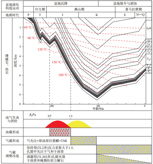 摘要: 四川盆地东南部二叠系长兴组天然气聚集成藏规律复杂,为此,基于热演化史恢复、岩石薄片、矿物同位素、流体包裹体等分析手段,研究了该区烃源岩热演化供烃过程、储层成岩作用和孔隙演化、古油藏热裂解记录,揭示了长兴组天然气藏成藏演化过程。研究表明,该区长兴组颗粒滩相和生物礁相以及白云岩化控制了优质储层的发育;中—晚侏罗世原油充注形成古油藏,晚侏罗世—早白垩世古油藏发生相态转化,原油原位热裂解并发生一定的硫酸盐还原作用,古油藏相态转化成为高温高压气藏;喜马拉雅期川东南地区强烈的挤压变形过程中,古气藏发生位置调整,弱构造变形区良好的保存条件是气藏持续保存的关键,储层孔隙中赋存干沥青和干气,而强变形区保存条件变差,气藏中的天然气发生泄漏,储层孔隙中除油藏裂解产生的干沥青外,还发育晚期方解石胶结,使储层发生致密化。因此,四川盆地东南部地区二叠系长兴组优质储层和气藏保存条件是天然气规模有效聚集的关键。Abstract: The Permian Changxing Formation in the southeastern Sichuan Basin has complex natural gas accumulation patterns. Using analysis methods such as thermal evolution history reconstruction, rock thin sections, mineral isotopes, and fluid inclusions, this study investigated the hydrocarbon generation process of source rocks, reservoir diagenesis and pore evolution, and thermal cracking records of paleo-oil reservoirs, thereby revealing the evolution process of natural gas accumulation in the Changxing Formation. The study showed that the development of high-quality reservoirs was controlled by grain shoal facies, reef facies, and dolomitization. During the Middle and Late Jurassic, crude oil charging formed paleo-oil reservoirs, which subsequently underwent phase transformation in the Late Jurassic to Early Cretaceous. This process involved in-situ thermal cracking of crude oil accompanied by partial sulfate reduction, transforming the paleo-oil reservoirs into high-temperature, high-pressure gas reservoirs. During the Himalayan orogeny, the intense compressional deformation in southeastern Sichuan caused positional readjustment of paleo-gas reservoirs. The favorable preservation conditions in weak structural deformation zones proved critical for the sustained preservation of these gas reservoirs. The reservoir pores contained pyrobitumen and dry gas, while the strong deformation zones exhibited poorer preservation conditions, leading to natural gas leakage. In addition to the pyrobitumen formed by oil cracking, the reservoir pores also developed late-stage calcite cementation, resulting in reservoir densification. Therefore, the preservation conditions of high-quality reservoirs and gas accumulations in the Permian Changxing Formation are crucial for the effective large-scale accumulation of natural gas in the southeastern Sichuan Basin.