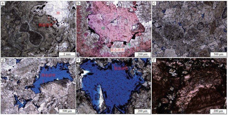 a.TL202井,4 968.85 m,藻礁灰岩的藻纹层结构,格架孔内见2个世代方解石胶结,孔隙中充填亮晶方解石,方解石颗粒边缘可见沥青充填;b.TL202井,4 976.7 m,生物格架孔中发育世代方解石胶结,Ⅰ世代为纤维状胶结,Ⅱ世代白云石胶结及Ⅲ世代柱状亮晶方解石充填,Ⅱ世代白云石与Ⅲ世代方解石间见干沥青充填;c.XL1井,4 600.2 m,粉—细晶白云岩及残余粒屑结构,发育晶间孔;d.XL1井,4 605 m,白云岩中发育晶间孔及晶间溶孔,孔隙边缘固体沥青充填; e.XL1井,4 600.2 m,残余粒屑粉—细晶云岩中的晶间溶蚀扩大孔,晶边呈港湾状溶蚀特征,孔隙边缘固体沥青充填;f. TL202井,5 237.8 m,泥—亮晶藻屑灰岩中的早期方解石胶结作用,孔隙被充填。