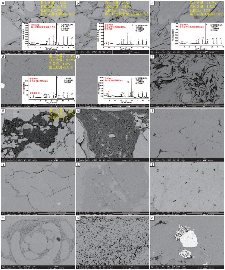 a, b.露头照片,黏土矿物呈条带状(a)和眼皮状(b);c-f.岩心照片,黏土矿物呈眼皮状(c)、不规则斑块状(d)、星点状(e)和交代生物壳体(f);g-i.显微镜下照片,黏土矿物交代有孔虫壳体(g),条带状顺层分布(h)和星点状(i);j-l.氩离子抛光电镜照片,黏土矿物交代有孔虫(j),呈片状集合体(k)和与方解石、石英等矿物共生(l)。