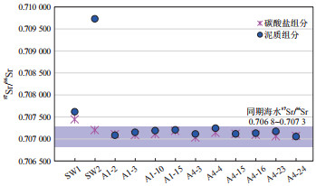 样品编号 碳酸盐组分 泥质组分 样品编号 碳酸盐组分 泥质组分 87Sr/86Sr 1SE 87Sr/86Sr 1SE 87Sr/86Sr 1SE 87Sr/86Sr 1SE SW1 0.707 446 0.000 004 0.707 622 0.000 005 A4-3 0.707 034 0.000 005 0.707 117 0.000 004 SW2 0.707 203 0.000 005 0.709 732 0.000 005 A4-4 0.707 142 0.000 014 0.707 249 0.000 005 A1-2 0.707 106 0.000 006 0.707 088 0.000 005 A4-15 0.707 118 0.000 006 0.707 119 0.000 005 A1-3 0.707 089 0.000 006 0.707 154 0.000 004 A4-16 0.707 097 0.000 006 0.707 134 0.000 005 A1-10 0.707 111 0.000 005 0.707 192 0.000 005 A4-23 0.707 063 0.000 005 0.707 176 0.000 005 A1-15 0.707 187 0.000 005 0.707 210 0.000 005 A4-24 0.707 070 0.000 006 0.707 059 0.000 004 -