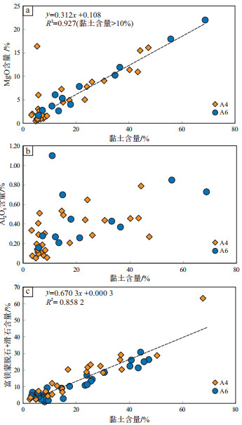 摘要: 近年来,四川盆地多口井在中二叠统茅口组一段(茅一段)(含)泥灰岩地层中钻获工业气流,展示出良好的勘探潜力。早期研究认为,茅一段(含)泥灰岩具有自生自储的特征,是一套低孔、低渗的裂缝—孔隙型致密碳酸盐岩储层,储集空间多样,海泡石向滑石转化过程中形成的成岩收缩孔缝对储集空间贡献较大。为进一步探讨茅一段黏土矿物的成因及其储集意义,采集川南6口钻井和1条野外剖面的茅一段岩样,通过显微镜、氩离子电镜、X射线衍射(XRD)、主微量元素、锶同位素(87Sr/86Sr)、孔隙度、氮气吸附等实验手段,对茅一段(含)泥灰岩中黏土矿物进行研究。镜下观察与XRD结果显示,川南茅一段黏土矿物多以基质、不规则斑块(点)状和交代钙质生物壳体等形式产出,以滑石、富镁蒙脱石等镁质黏土矿物为主,含少量海泡石。此外,茅一段(含)泥灰岩的Al2O3含量、ΣREE含量较低,Y/Ho比值和87Sr/86Sr值类似于同期海水,表明陆源输入的碎屑少,茅一段镁质黏土矿物最初(海泡石阶段)为沉积—早成岩期形成的自生黏土。茅一段储层的孔隙度/孔容与黏土矿物总量、富镁蒙脱石含量呈正相关,与滑石含量无明显相关性,甚至轻微负相关,表明川南茅一段泥灰岩储层的储集空间受黏土总含量及成岩演化阶段影响。孔隙空间整体随黏土含量增多而增大,热演化处于成熟—高成熟阶段,黏土矿物以富镁蒙脱石为主时,黏土孔缝发育,储集物性好;过高的成岩演化(热演化处于过成熟阶段,滑石化程度高)不利于孔隙的发育。Abstract: In recent years, multiple wells in the Sichuan Basin have produced industrial gas from the marlstone/marl-bearing limestone strata in the first member of the Middle Permian Maokou Formation (Mao 1), demonstrating promising exploration potential. Previous studies have suggested that the marlstone/marl-bearing limestone in Mao 1 exhibits self-generation and self-storage characteristics, forming low-porosity, low-permeability fracture-porosity type tight carbonate reservoirs with diverse storage spaces. Notably, diagenetic shrinkage pores and fractures formed during the transformation of sepiolite to talc contribute significantly to the storage space. To further investigate the genesis of clay minerals in Mao 1 and their significance for reservoir storage, rock samples were collected from six wells and one outcrop in the southern Sichuan Basin. A series of analyses, including microscopy, argon ion microscopy, X-ray diffraction (XRD), major and trace element analysis, strontium isotopic ratios (87Sr/86Sr), porosity tests, and nitrogen (N2) adsorption experiments, were conducted to study the characteristics of clay minerals in the marlstone/marl-bearing limestone of Mao 1. Microscopic observations and XRD results showed that the clay minerals mainly occurred as matrix minerals, irregular patches/spots, and replacements of biogenic calcareous shells. These minerals were primarily magnesian clay minerals such as talc and magnesium-rich montmorillonite, with minor amounts of sepiolite. Additionally, the marlstone/marl-bearing limestone in Mao 1 had relatively low Al2O3 contents and ΣREE concentrations, and its Y/Ho ratios and 87Sr/86Sr values resembled those of contemporaneous seawater, indicating limited terrigenous clastic input. This suggested that the magnesian clay minerals were originally authigenic clays formed during the deposition-early diagenesis period (in the sepiolite stage). The porosity/pore volume of the reservoir was positively correlated with the total clay mineral content and the magnesium-rich montmorillonite content, but no significant correlation or even a slight negative correlation was observed with the talc content. This indicated that the storage space in the marlstone reservoir was affected by the total clay content and the diagenetic evolution stage. The overall pore space increased with higher clay content. When thermal evolution was at the mature to highly mature stage and magnesium-rich montmorillonite was dominant, clay pores and fractures were developed, enhancing reservoir properties. However, excessive diagenetic evolution (over-mature thermal stage with higher talc content) was unfavorable for pore development.