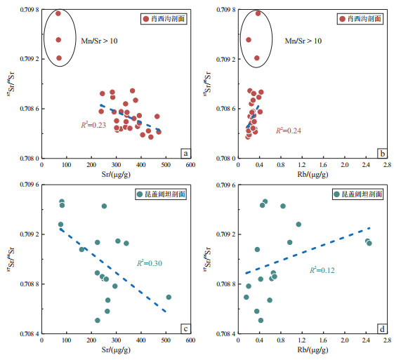 样品号 岩性 高度/cm δ13Ccarb/‰ δ18Ocarb/‰ 87Sr/86Sr ±σ Ca/% Mg/% Mn/(μg/g) Rb/(μg/g) Sr/(μg/g) Mn/Sr kgkt-3-1 白云岩 410 -3.88 -7.29 kgkt-4-2 灰岩 520 -3.48 -7.54 25.08 10.66 1 274.71 1.17 146.87 8.68 kgkt-4-4 灰岩 570 -3.70 -7.80 25.29 10.51 1 290.38 1.29 142.31 9.07 kgkt-4-6 灰岩 600 -4.03 -5.87 25.75 10.18 1 316.81 2.17 165.86 7.94 kgkt-4-8 灰岩 650 -2.28 -7.62 0.708 844 0.000 003 37.33 1.91 660.77 0.63 248.54 2.66 kgkt-4-9 灰岩 690 -2.32 -7.41 0.709 136 0.000 005 36.61 2.42 901.68 0.97 224.13 4.02 kgkt-4-11 灰岩 750 -2.09 -6.94 0.708 890 0.000 006 38.03 1.41 735.33 0.66 223.42 3.29 kgkt-4-12 灰岩 770 -1.82 -7.47 38.83 0.83 1 048.20 0.66 256.80 4.08 kgkt-4-13 灰岩 780 -3.39 -7.36 38.81 0.85 993.27 0.66 225.88 4.40 kgkt-4-14 灰岩 810 -0.77 -7.23 0.708 507 0.000 005 39.41 0.42 687.01 0.42 224.52 3.06 kgkt-4-15 灰岩 830 -2.68 -7.53 39.47 0.38 2 324.77 0.57 255.41 9.10 kgkt-4-16 灰岩 865 -0.57 -7.41 0.709 146 0.000 003 39.29 0.51 1 119.21 2.43 306.52 3.65 kgkt-4-17 灰岩 875 -0.91 -7.42 39.30 0.50 1 530.37 1.20 268.35 5.70 kgkt-4-18 灰岩 895 -0.15 -7.31 39.26 0.53 847.24 0.62 269.19 3.15 kgkt-4-19 灰岩 910 -0.46 -7.38 0.709 427 0.000 004 39.14 0.61 1 263.98 0.84 251.31 5.03 kgkt-5-1 瘤状白云岩 990 -2.52 -9.66 22.96 12.17 539.37 0.16 101.91 5.29 kgkt-5-2 瘤状灰岩 1 020 0.04 -7.52 0.708 860 0.000 006 39.04 0.68 592.52 0.68 243.51 2.43 kgkt-5-3 瘤状灰岩 1 144 -1.07 -7.22 0.708 670 0.000 004 39.25 0.54 593.73 0.59 266.18 2.23 kgkt-5-4 瘤状灰岩 1 242 -1.14 -7.75 0.708 581 0.000 006 39.45 0.39 694.86 0.35 263.84 2.63 kgkt-5-5 瘤状灰岩 1 359 -1.52 -6.97 0.708 783 0.000 004 39.47 0.38 1 805.01 0.19 294.81 6.12 kgkt-5-6 瘤状灰岩 1 411 -0.70 -7.42 39.54 0.33 706.53 0.24 321.60 2.20 kgkt-5-7 泥质灰岩 1 474 -0.31 -7.97 0.709 128 0.000 007 39.42 0.41 1 418.82 2.46 340.42 4.17 kgkt-5-8 泥质灰岩 1 494 -0.66 -7.70 39.51 0.35 1 225.09 0.61 242.22 5.06 kgkt-5-9 泥质灰岩 1 524 -0.85 -7.90 39.56 0.31 1 149.80 0.51 231.35 4.97 kgkt-5-9-1 泥质灰岩 1 544 -0.90 -6.77 0.708 840 0.000 006 39.41 0.42 532.71 0.42 259.58 2.05 kgkt-5-10 泥质灰岩 1 664 -4.29 -9.71 0.708 694 0.000 008 38.80 0.85 148.84 0.15 511.09 0.29 kgkt-5-11 泥质白云岩 1 744 -2.29 -9.05 0.709 078 0.000 005 24.42 11.13 236.47 0.36 160.69 1.47 kgkt-5-12 泥质白云岩 1 844 -1.99 -9.64 22.11 12.78 211.17 0.55 96.53 2.19 kgkt-5-13 泥质白云岩 1 964 -1.42 -8.32 0.709 465 0.000 007 21.83 12.98 175.81 0.51 80.69 2.18 kgkt-5-14 泥质白云岩 2 084 -1.36 -8.19 22.26 12.67 189.82 1.00 100.91 1.88 kgkt-5-15 泥质白云岩 2 184 -0.87 -8.41 0.709 434 0.000 006 22.09 12.80 168.20 0.45 81.93 2.05 kgkt-5-16 泥质白云岩 2 234 -0.75 -8.36 22.32 12.63 181.63 2.99 90.69 2.00 kgkt-5-17 泥质白云岩 2 264 -0.61 -8.70 0.709 280 0.000 006 22.18 12.73 169.80 1.13 76.33 2.22 -