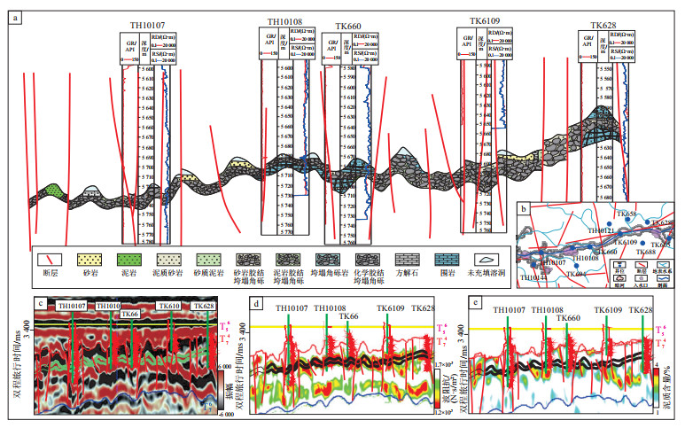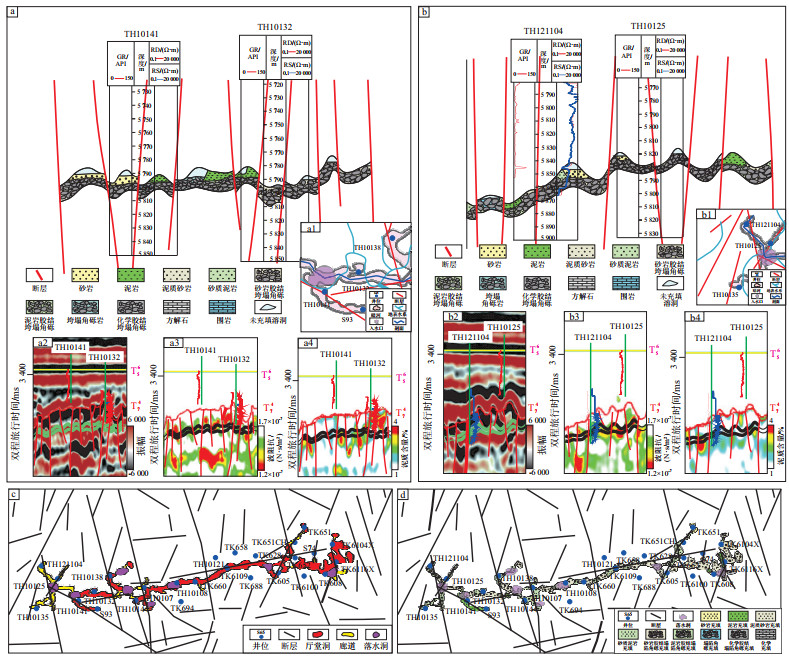 a.TH10132—TH10141井段连井充填剖面;a1为断裂、古水系平面叠合分布,a2、a3、a4分别为常规地震、波阻抗反演和泥质反演剖面;b.TH10125—TH121104井段连井充填剖面;b1为断裂、古水系平面叠合分布,b2、b3、b4分别为常规地震、波阻抗反演和泥质反演剖面;c.TH10107CH暗河岩溶要平面分布;d.TH10107CH暗河充填物平面分布。