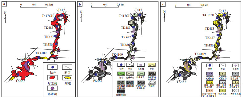 Figure 5. Planar distribution of karst elements (a), filling characteristics (b), and filling combinations (c) at top part of S65 underground river in Tahe area