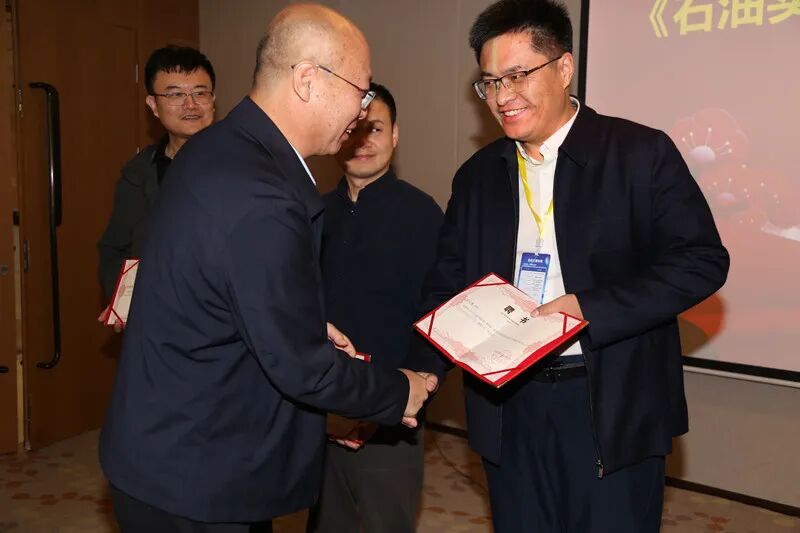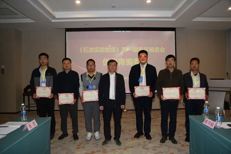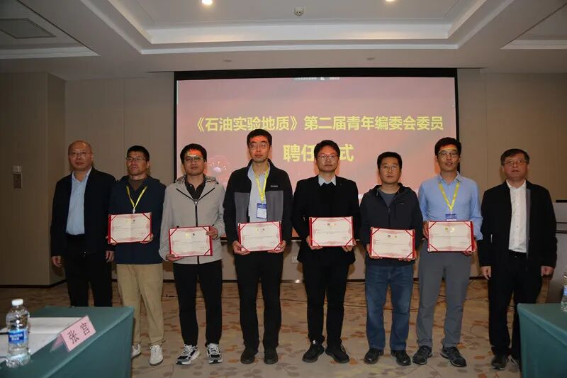 无锡石油地质研究所党委书记、副所长、《石油实验地质》编委杨伟利研究员与方成名所长共同为新一届青年编委代表颁发聘书。